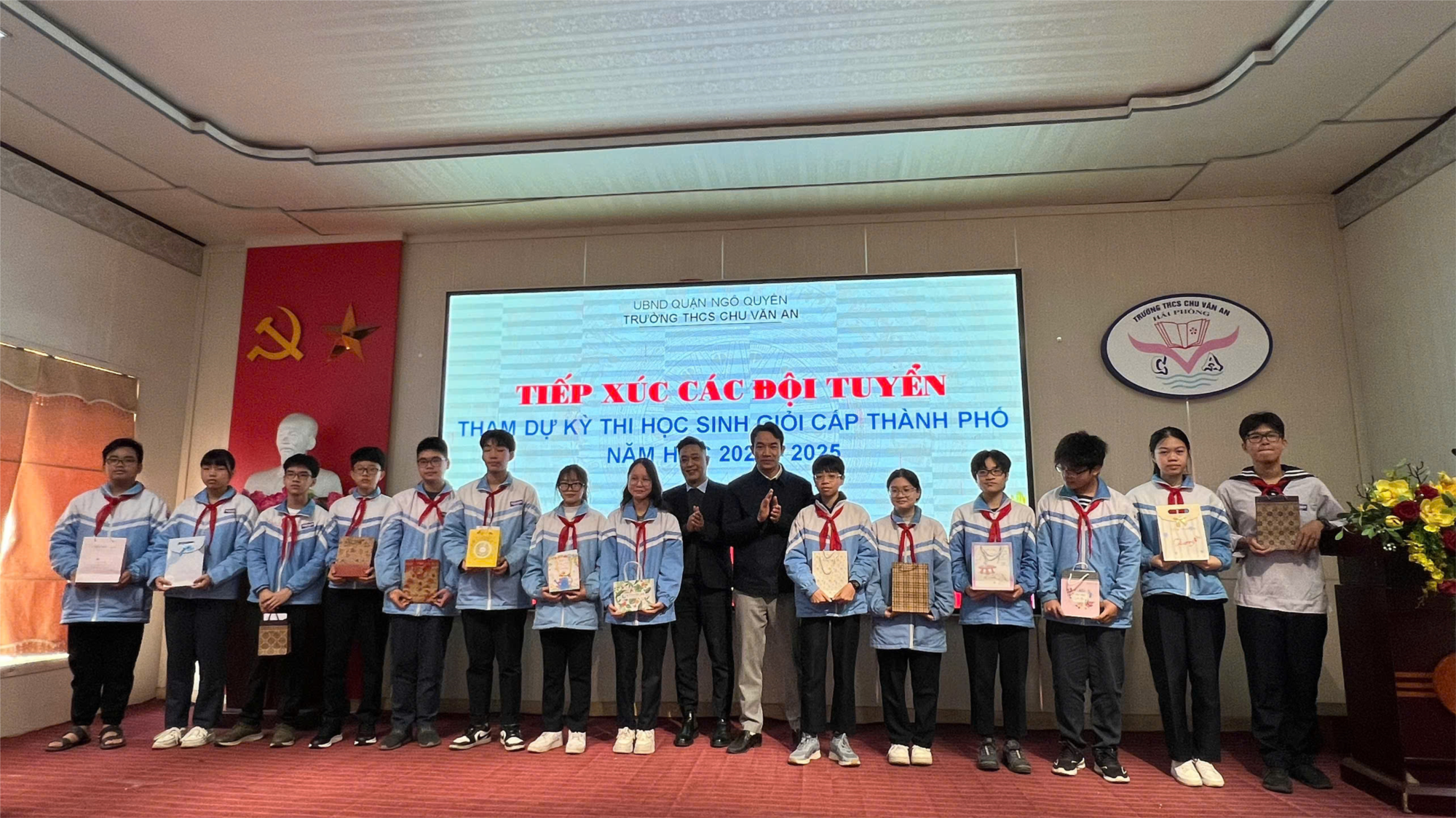 Trong chương trình, nhà trường đã tổ chức trao những phần quà nhỏ động viên tinh thần và chụp ảnh lưu niệm cùng các em học sinh trong 14 đội tuyển HSG.