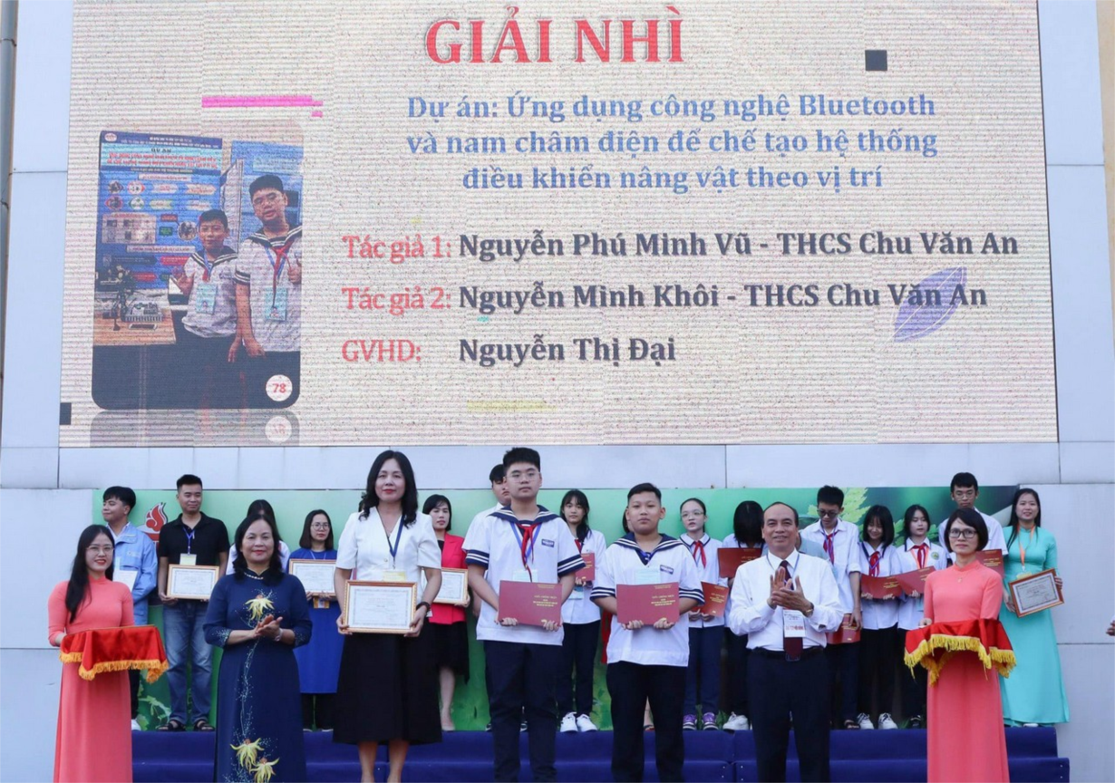 Xin chúc mừng dự án “Ứng dụng công nghệ Bluetooth và nam châm điện để chế tạo hệ thống điều khiển nâng vật theo vị trí” của nhóm tác giả Nguyễn Phú Minh Vũ lớp 8C11 và Nguyễn Minh Khôi lớp 8C7 dưới sự hướng dẫn của cô giáo Nguyễn Thị Đại trường THCS Chu Văn An đã đạt giải Nhì cấp thành phố.