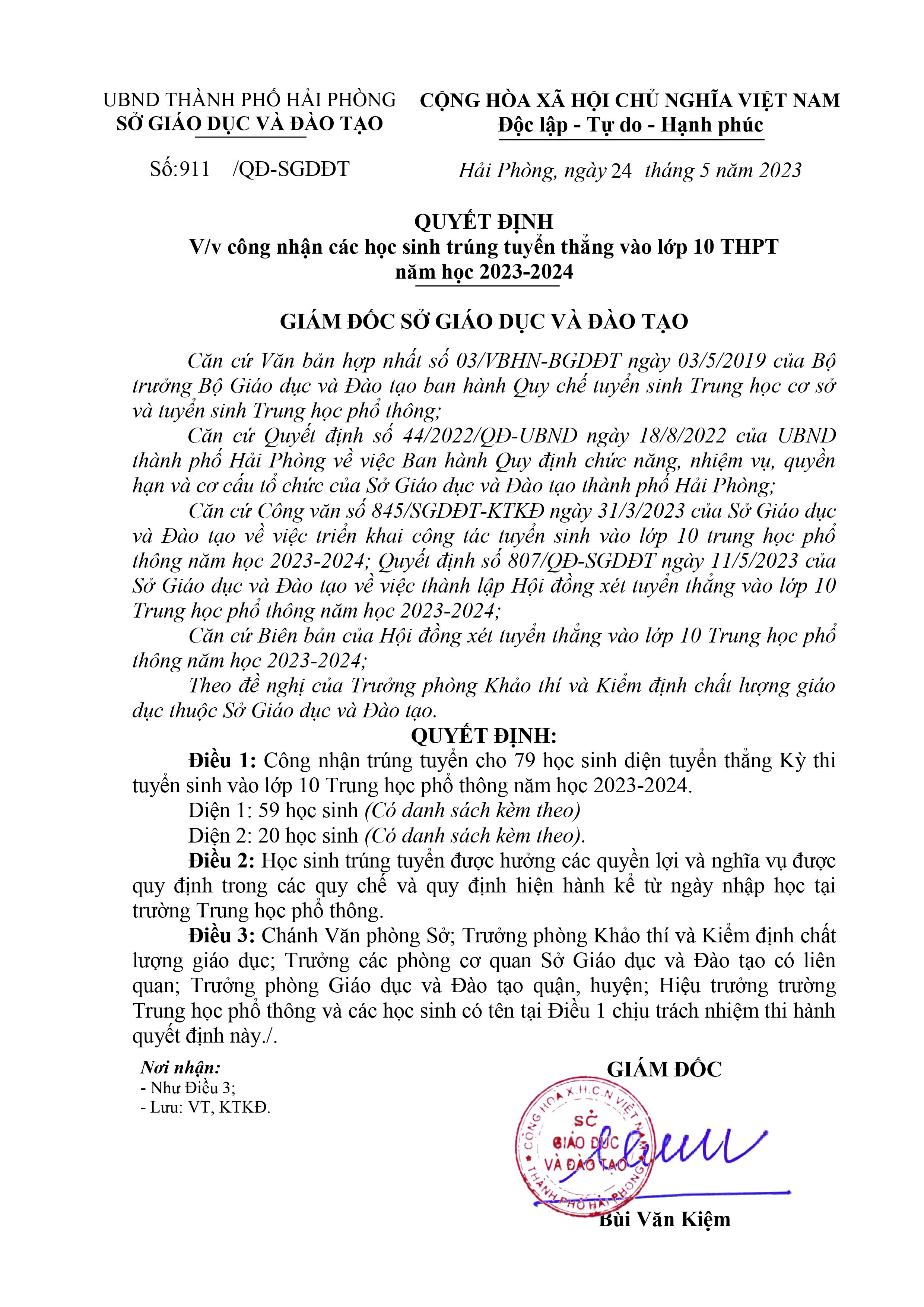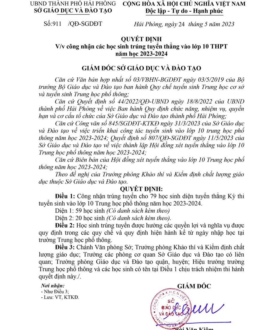 Ngày 24/5/2023 Sở GD & ĐT Hải Phòng đã có công văn chính thức số 911/QĐ – SGDĐT công bố kết quả xét tuyển thẳng vào lớp 10 THPT năm học 2023 – 2024 cho học sinh có thành tích đặc biệt. Theo quyết định, toàn thành phố có 79 em vinh dự nhận được kết quả tốt đẹp này.
