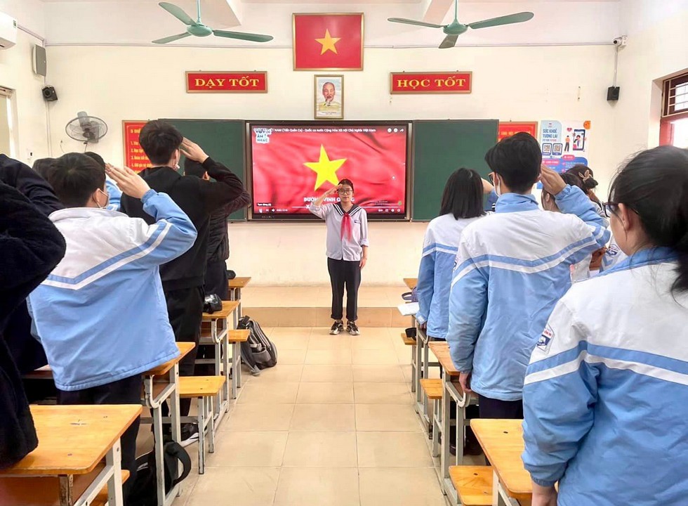 Mở đầu nghi thức chào cờ diễn ra nghiêm túc và đầy tự hào. Lời hát Quốc ca, Đội ca vang lên hòa cùng nhịp trống của đội nghi lễ khiến không khí thêm phần nghiêm trang.