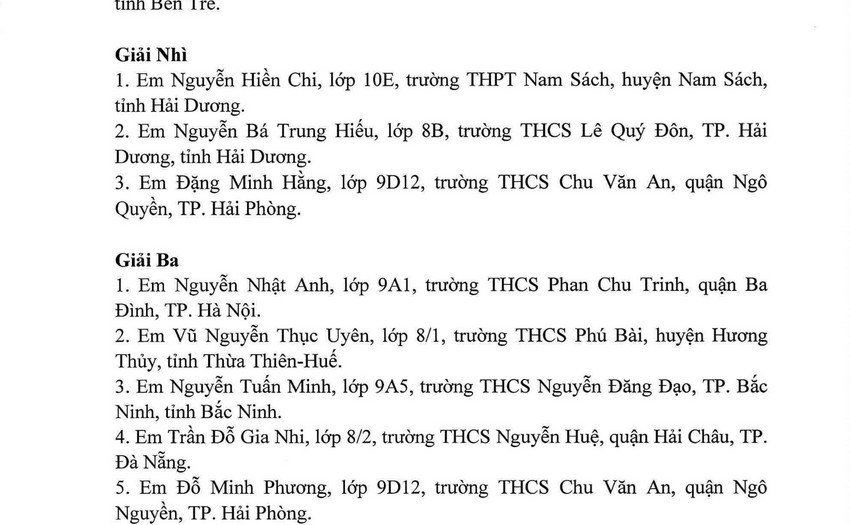 Vượt qua rất nhiều bài thi có chất lượng, hai học sinh của trường đều đạt kết quả cao : Học sinh Đặng Minh Hằng, đạt giải Nhì; Học sinh Đỗ Minh Phương đạt giải Ba đều là học sinh lớp 9D12 trường THCS Chu Văn An. Nhà trường cũng vinh dự được Ban tổ chức cuộc thi tặng giải Nhì tập thể . Những giải thưởng này đã tiếp nối vào bảng vàng thành tích rất đỗi tự hào của thầy và trò nhà trường trong năm học 2022-2023.