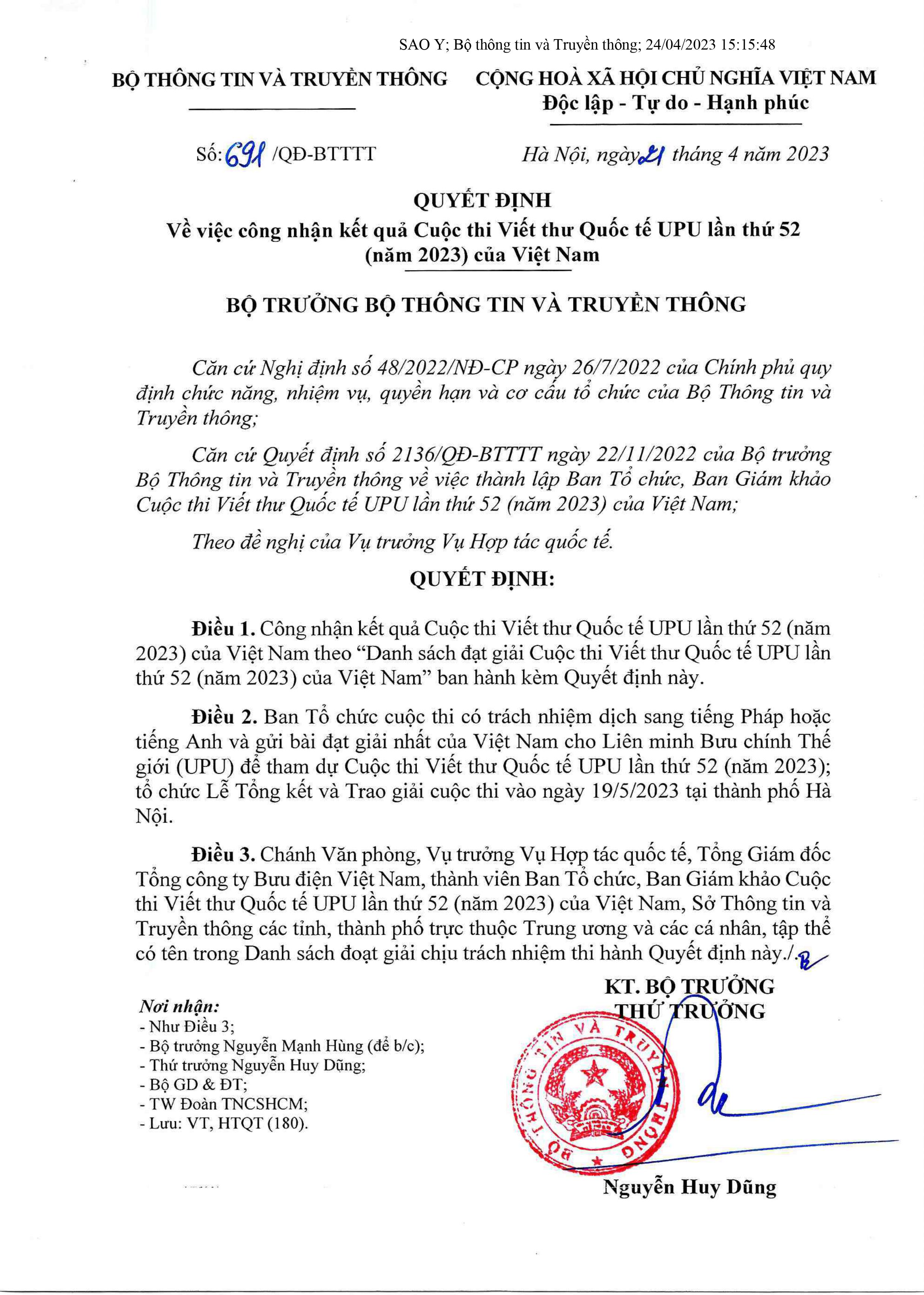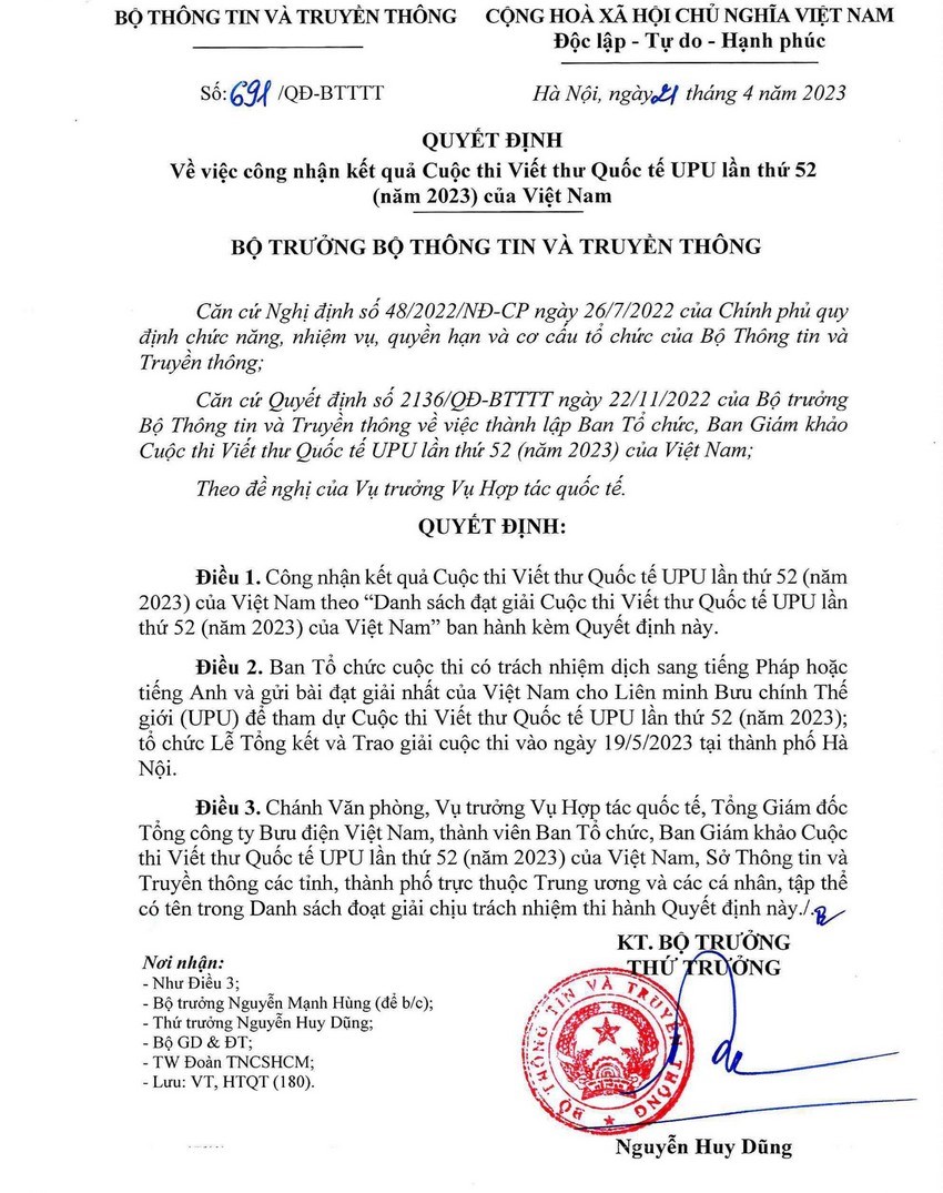 Cuộc thi Viết thư Quốc tế UPU của Liên minh Bưu chính Thế giới( UPU) lần thứ 52( năm 2023) được Bộ Thông tin và Truyền thông phối hợp với Bộ Giáo dục và Đào tạo, Hội Nhà văn Việt Nam, Trung ương Đoàn Thanh niên cộng sản Hồ Chí Minh, TCT Bưu điện Việt Nam và Báo Thiếu niên Tiền phong và Nhi đồng tổ chức. Mục đích và ý nghĩa của Cuộc thi là góp phần phát triển khả năng viết văn và sự phong phú trong tư duy sáng tạo của các em; Giúp các em tiếp cận và nhận thức các vấn đề của xã hội, của thời đại đồng thời thể hiện suy nghĩ của mình đối với những vấn đề này. Qua đó bồi đắp, nuôi dưỡng tình cảm, trách nhiệm của thế hệ trẻ đối với xã hội, đất nước và thế giới.