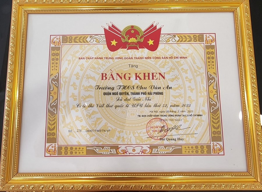 TRƯỜNG THCS CHU VĂN AN VINH DỰ NHẬN BẰNG KHEN TRONG CUỘC THI VIẾT THƯ QUỐC TẾ UPU LẦN THỨ 52