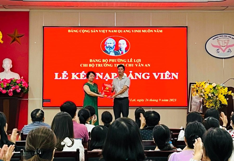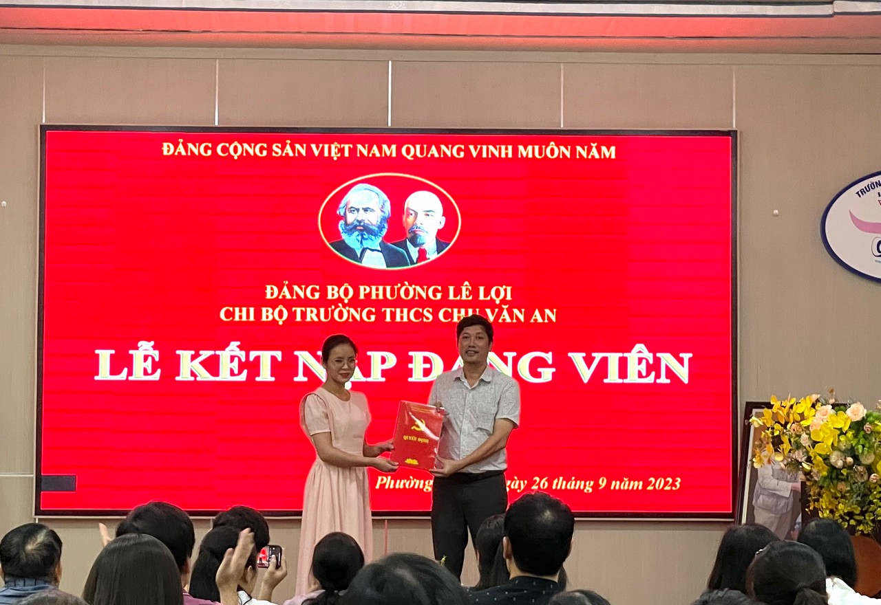 Thực hiện Nghị quyết Đại hội chi bộ nhiệm kì 2022-2025 và chương trình công tác năm 2023 đồng thời được sự nhất trí của Đảng uỷ phường Lê Lợi, ngày 26/9/2023 Chi bộ trường THCS Chu Văn An đã tổ chức Lễ kết nạp đảng viên cho 5 quần chúng ưu tú: 1. Lưu Thị Thảo 2. Nguyễn Thị Thanh Tâm 3. Vũ Thị Hương 4. Nguyễn Tiến Thành 5. Nguyễn Thu Hằng