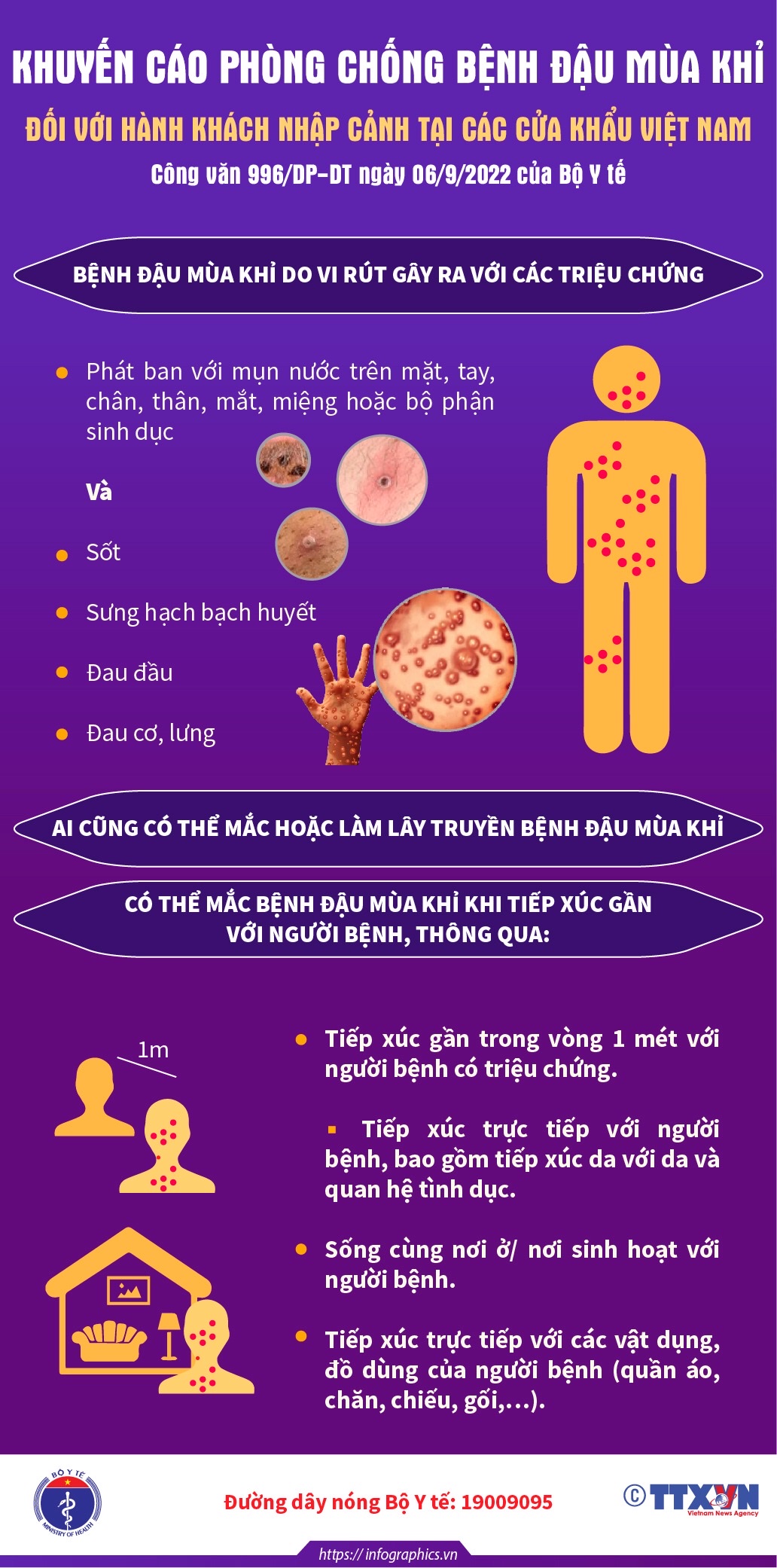 5. Người đến các quốc gia có lưu hành dịch bệnh đậu mùa khỉ (khu vực Trung và Tây Phi), cần tránh tiếp xúc với động vật có vú (chết hoặc sống) như: động vật gặm nhấm, thú có túi, động vật linh trưởng có thể chứa vi rút đậu mùa khỉ. Khi quay trở về Việt Nam cần chủ động khai báo với cơ quan y tế địa phương để được tư vấn.
